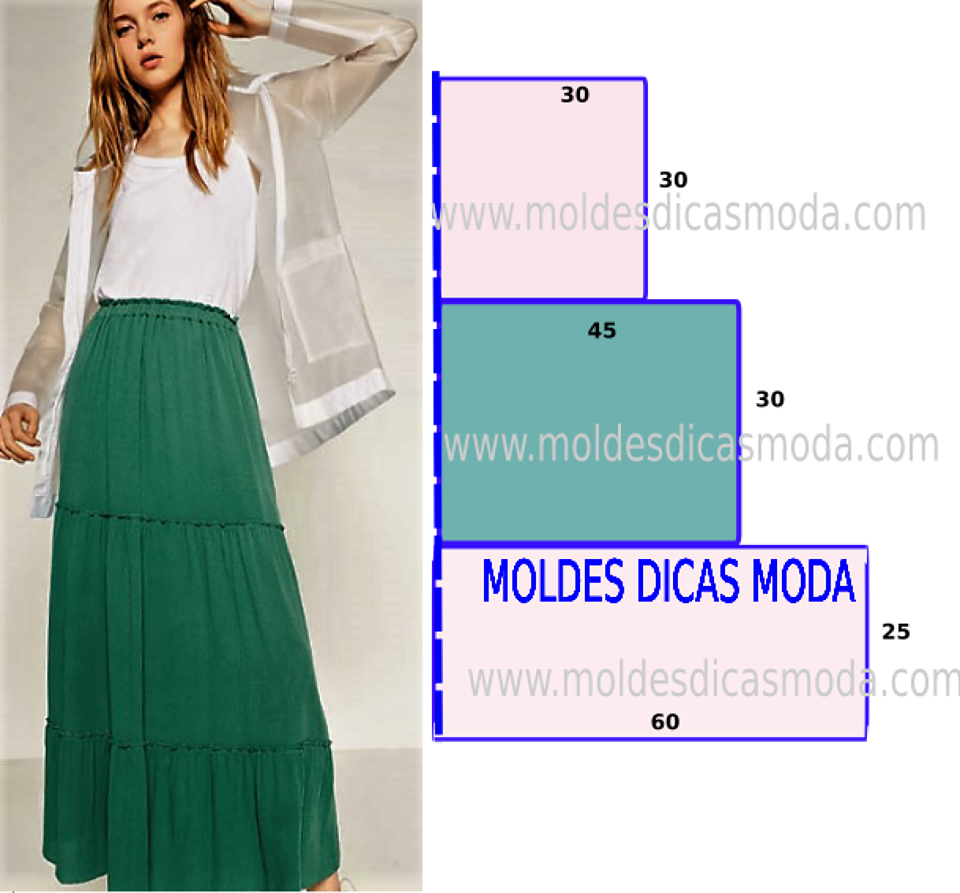 Molde e costura de saia longa casual - Moldes Moda por Medida O molde de saia longa casual encontra-se no tamanho único. A ilustração do molde de saia não tem valor de costura tem que ser acrescentado. Este trabalho tem como objectivo ajudar quem não tem impressora.