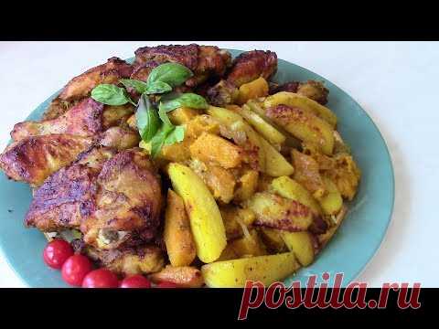 Курица , запеченная с картошкой и тыквой . Рецепт куриный .