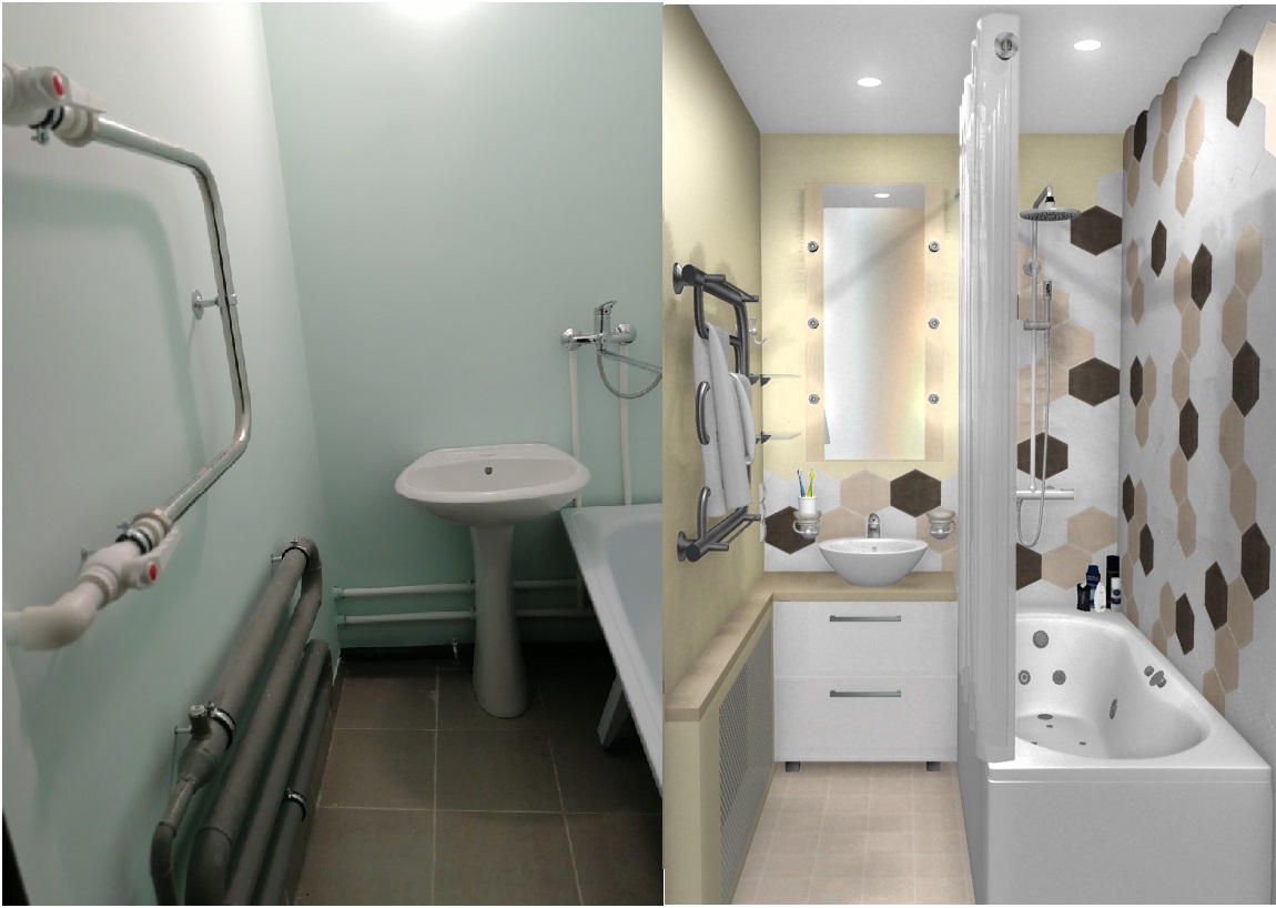 Фото помещения сейчас и дизайн-проект с того же ракурса. Ванная 2,6 м2 и туалет 1,6 м2 Батарею в ванной закрыли щитом, в туалете трубы спрятали в короба и обшили плиткой. Так же в туалете разместился бойлер на 80 литров Альбом квартиры полностью: https://vk.com/album-153501002_255505310 #работа#дизайн#интерьер#дизайнинтерьера