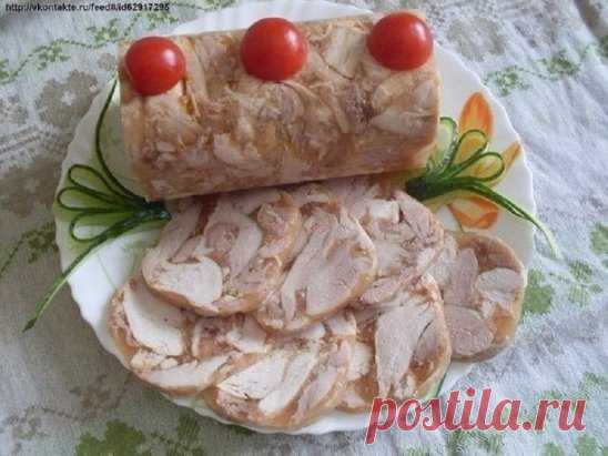 "Куриный рулет в бутылке" Ингредиенты: Курица — 1 Штука Грецкие орехи — 100 Грамм Желатин — 30 Грамм Чеснок — 2 Зубчика Соль и приправы — По вкусу 1. Для этого рулета можно брать целую курицу, а можно готовое филе (если любите постные рулеты). Кроме этого, мясо можно приготовить двумя способами: отварить, сделав бульон прозрачный (с овощами и зеленью), а можно протушить, как в нашем варианте. 2. Отправляем мясо на сковороду, не добавляя никаких жиров! Поставьте слабый огонь и начинайте тушить мя