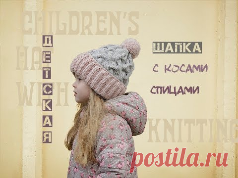 Детская шапка спицами. Шапка с косами спицами. Children's hat with knitting needles.