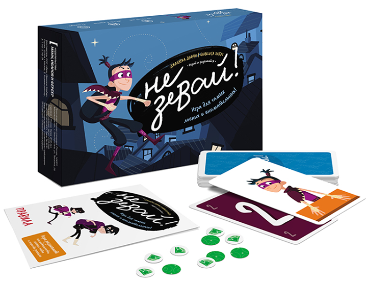 «Не зевай!» ( — игра для самых ловких и внимательных! Соберись и сосредоточься! Перед тобой весёлая игра на скорость реакции и внимательность. Правила простые: переверни две карты и быстрее соперника хлопни нужное количество раз по столу, перед собой или над головой. Опереди соседа и забирай у него изумруды! Победит самый богатый игрок! Будь на чеку, не зевай!