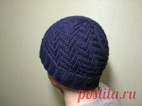 Мужская шапка с отворотом спицами с узором "рыбий скелет" ("рыбий хвост")