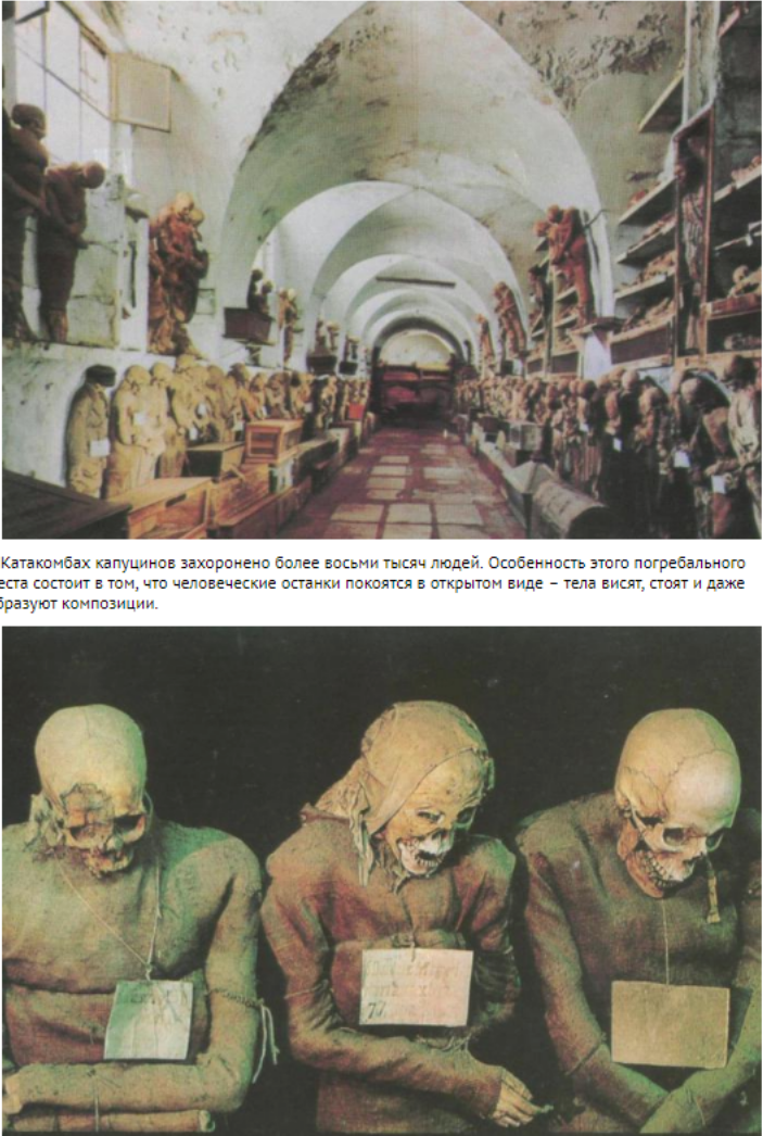 Катакомбы капуцинов в Палермо, Италия В Катакомбах капуцинов захоронено более восьми тысяч людей. Особенность этого погребального места состоит в том, что человеческие останки покоятся в открытом виде – тела висят, стоят и даже образуют композиции. Катакомбы были созданы в конце XVI столетия, когда число служителей монастыря капуцинов возросло настолько, что возникла потребность в большом вместительном месте захоронения. Спустя два века они стали достаточно престижным клад...
