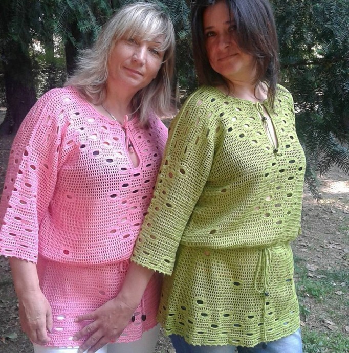 ТУНИКА (УЗОР) Использованый узор, обычная филейная сетка, связанная из столбиков с накидом + воздушная петля (или 2 воздушных петли). В месте где должны быть большие дырочки, провязываются столбики с накидом без воздушных петель в нижнем ряду, в следующем ряду количество столбиков (провязанных подряд) разделите на 4 части, одну часть провязываем столбиками с накидом, потом 2 части количества петель столбиков с накидом провязываем воздушными петлями, и снова часть петель с...