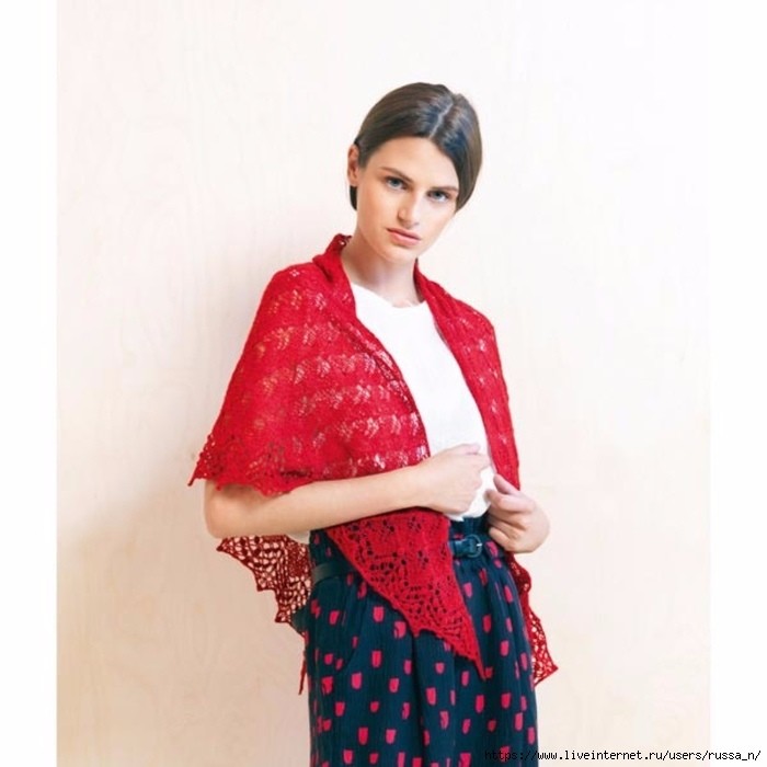 ШАЛЬ С УЗОРОМ ИЗ ЛИСТЬЕВ Размеры 160 х 80 см Материалы Пряжа Lamana Piura (100% альпака, 50 г/400 м) 2 мотка, спицы круговые 2 мм, крючок 2.5 мм Плотность вязания 24 петли и 34 ряда = 10х10 см чулочной вязкой в растянутом виде Набрать 4 петли и начать вязание по схеме 1, отметить маркером центр. петлю. В 9-ом ряду продолжить по схеме 2 (7 ряд включает схему 1 и схему 2 для того, чтобы было понятно распределение петель). Вязать узор с правой и левой стороны от централ...