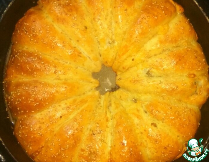 - Смазываем яйцом, посыпаем кунжутом и ставим в разогретую до 180 градусов духовку на 30 минут до зарумянивания пирога.
