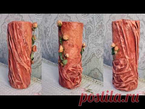Ваза из пластиковой бутылки, декорированная тканью и сушеными розами