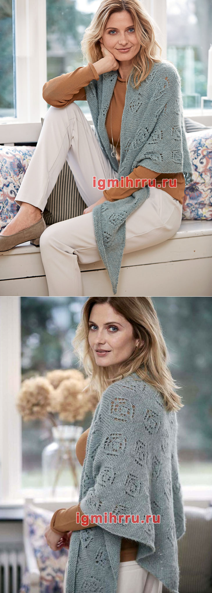 Треугольная шаль с ажурными мотивами. Вязание спицами
