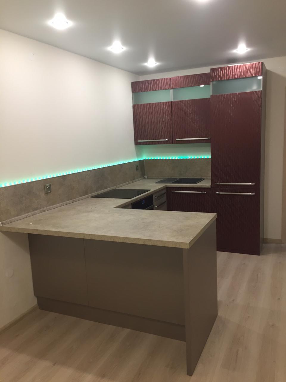 Кухонный Гарнитур #km96 г. Екатеринбург.ул. Чайковского, 68. Еланский дворик, жилой комплекс. Материал: Корпус lamarty розовый жемчуг. фасад МДФ Шампань Шагр.43(Кат-г МС ЭКО ). фасад МДФ Малиновый бархат. Столешница 38 мм Duropal Беж.Мраморная крошк. Кат.1 8191vv. еврозапил столешницы. Вставка стекло матовое белое. ПЕТЛЯ CLIP TOP BLUMOTION, НАКЛАДНАЯ, 110 ГР. Комплект TANDEM с BLUMOTION полного выдвижения. Светодиодная лента RPG с контроллером. профиль для свет-й ленты МИК 2000. Ручка-рейл