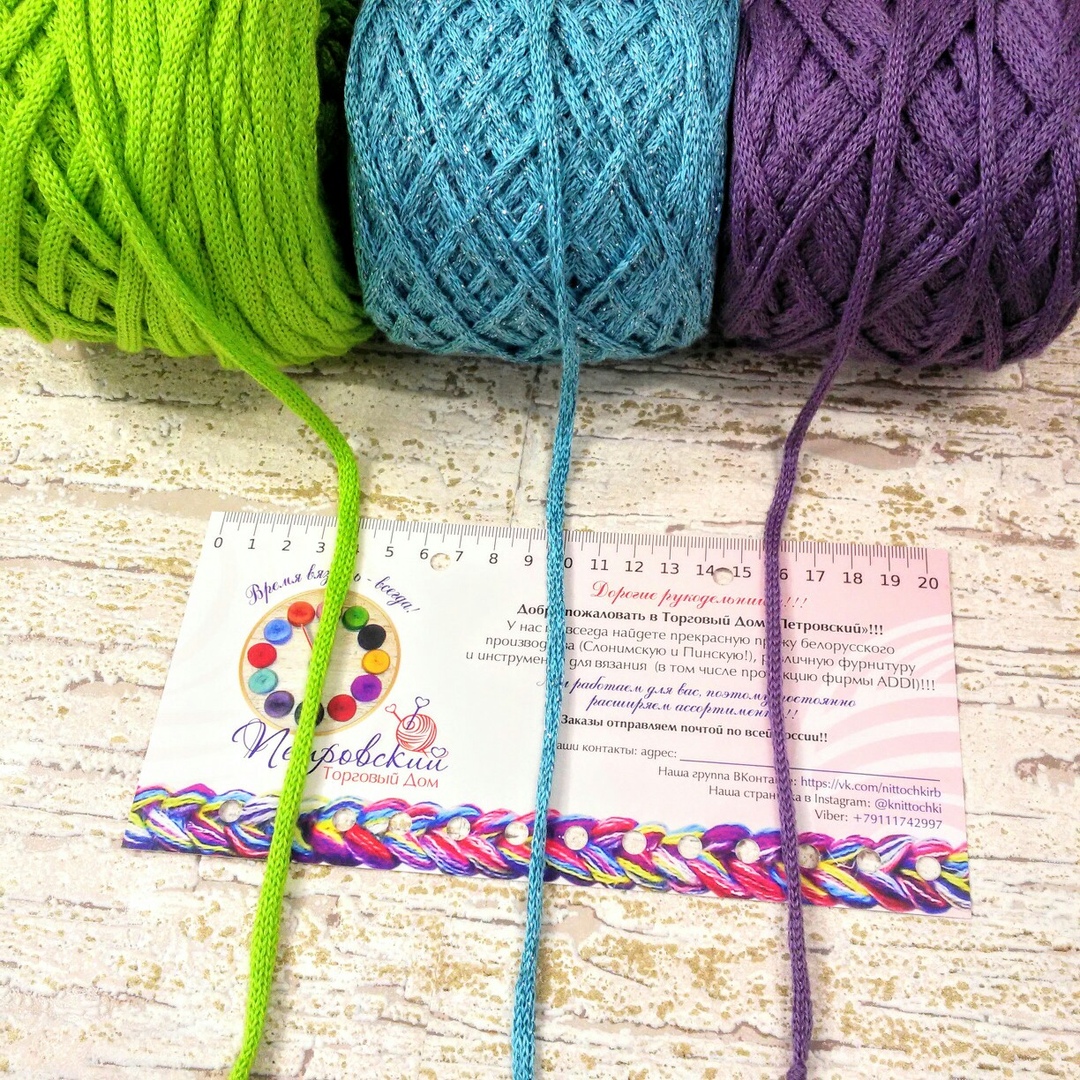 1. Толстый полухлопковый шнур - слева: толщина - 5 мм. Подходит для интерьерного вязания (корзинки, ковры и т.д.), для вязания сумок и т.п. Инструменты: крючок - №7-10, спицы - 7-12. 2. Шнур (полушерстяной с люрексом - в центре: толщина - 4 мм. Подходит для вязания одежды, пледов, накидок и сумок, не имеющих твердой формы.. Инструменты: крючок - № 5-8, спицы - 5-10 3. Тонкий полушерстяной шнур - справа: толщина - 3 мм. Подходит для вязания одежды, пледов, накидок и сумок, ...