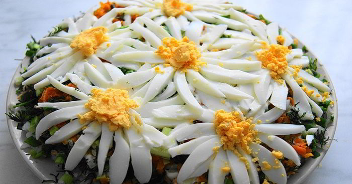 Слоеный салат «Ромашковое поле» Очень красивый слоеный салат «Ромашковое поле» готовится из довольно простых ингредиентов и при этом невероятно вкусный. А колоритное оформление с красочными ромашками всегда поднимет настроение, под…