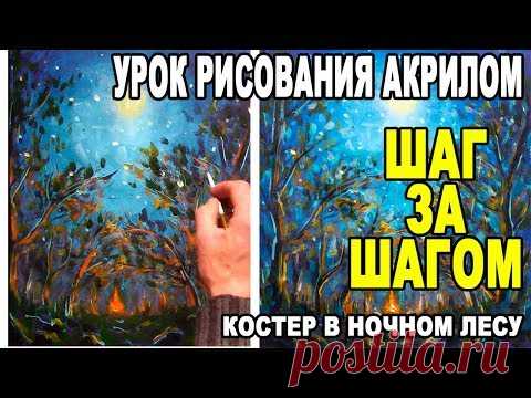 Костер в ночном лесу - Как нарисовать этот фантастический пейзаж акриловыми красками на холсте.