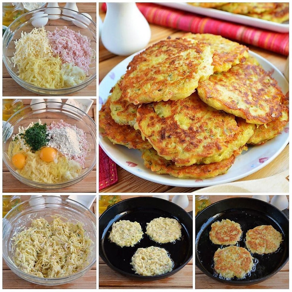 Дранички с ветчиной, сыром и зеленью Ингредиенты: Картофель — 6 Штук Лук — 1 Штука Ветчина — 200 Грамм Сыр твердый — 200 Грамм Яйцо — 2 Штуки Укроп — 1-2 Ст. ложек (мелко порезанный) Мука — 4-5 Ст. ложек Соль — По вкусу Перец черный молотый — По вкусу Масло рафинированное — 3-4 Ст. ложек (для жарки) Количество порций: 3-4 Как приготовить "Дранички с ветчиной, сыром и зеленью" 1. Подготовьте продукты, очистите картофель, лук, порежьте мелко укроп. 2. Натрите...