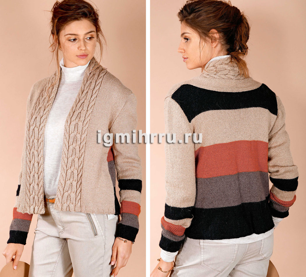 Эффектный жакет с полосами и «косами». Вязание спицами