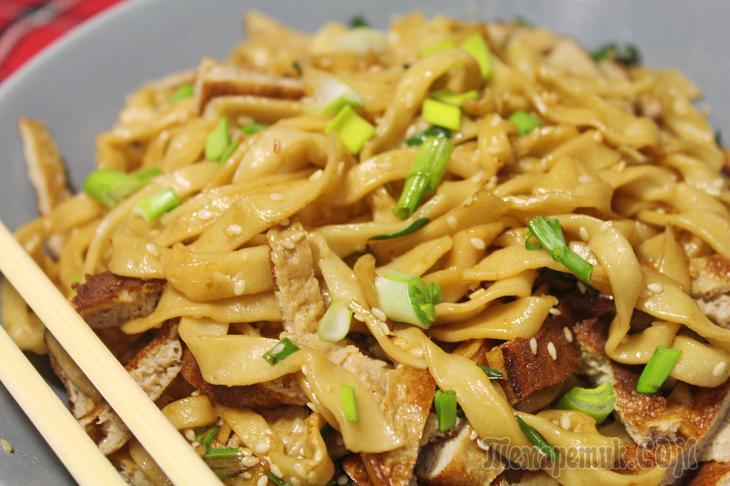 Домашняя яичная лапша с омлетом и зеленым луком.