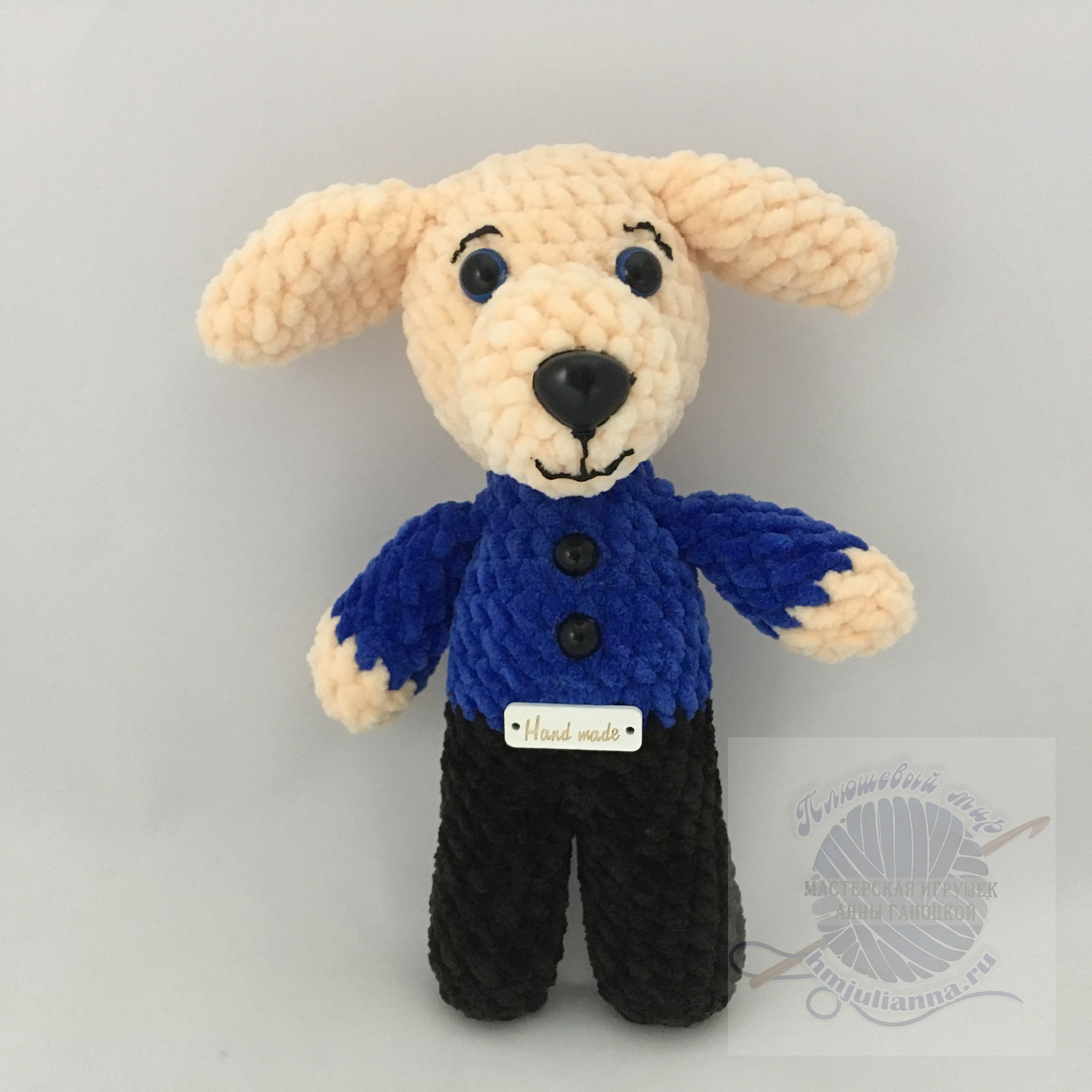 Вязаная собачка крючком, плюшевая игрушка в голубой рубашке, 24Плюшевый мир Мастерская игрушек Анны Ганоцкой