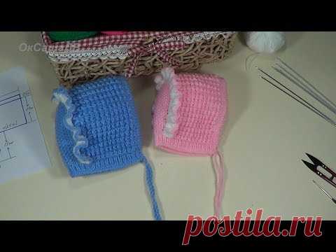 Детская шапочка (чепчик) с рюшкой. Вязание спицами. Children's knitted cap.