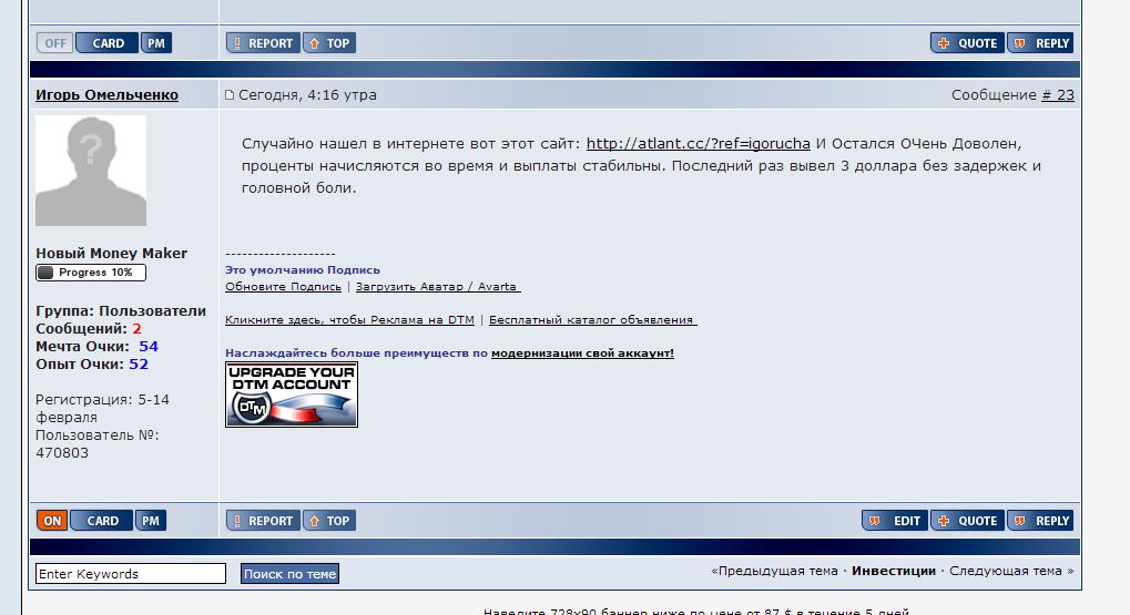 Хорошая система сбережения и приумножения денег, которая работает и выплачивает деньги: http://atlant.cc/?ref=igorucha