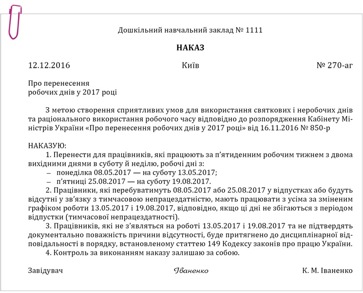 Приклад оформлення наказу про перенесення робочих днів – Практика управління дошкільним закладом № 1, січень 2017