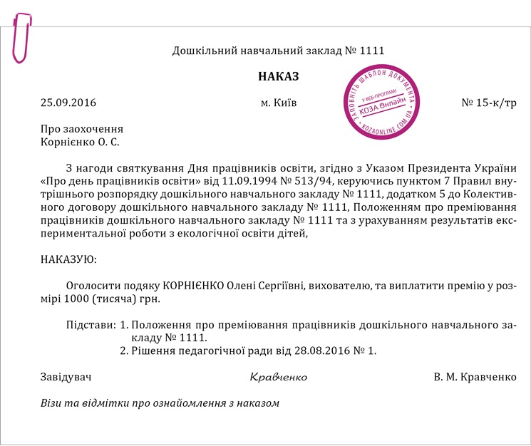 Приклад оформлення наказу про заохочення грошовою премією з нагоди професійного свята – Практика управління дошкільним закладом № 7, липень 2017