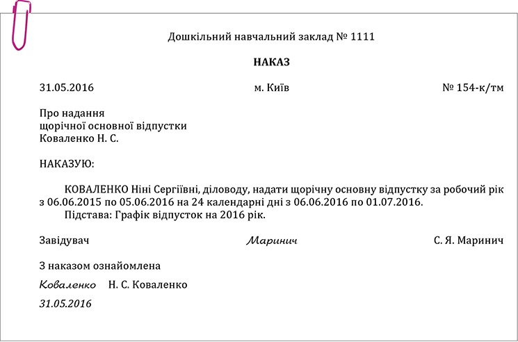 Приклад оформлення наказу про надання щорічної основної відпустки – Практика управління дошкільним закладом № 4, квітень 2017