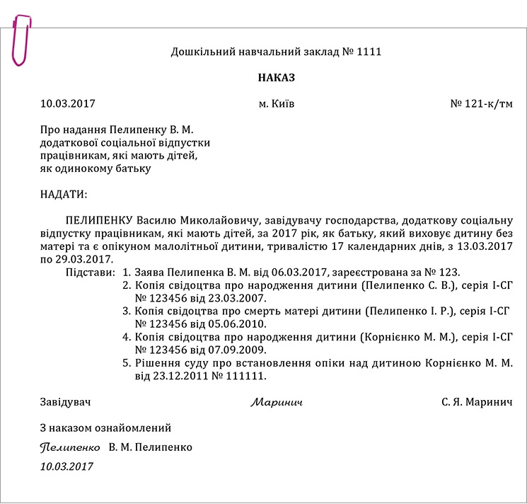 Приклад оформлення наказу про надання додаткової соціальної відпустки працівникам, які мають дітей – Практика управління дошкільним закладом № 4, квітень 2017