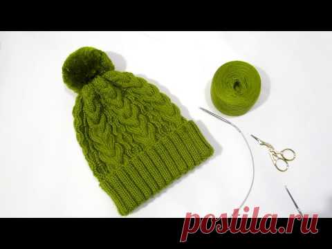 Оливковая шапка спицами. Теплая шапка с отворотом.