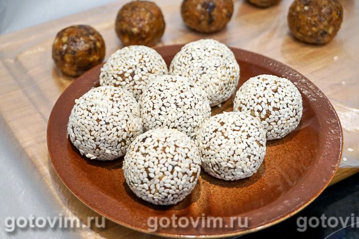 - Обвалять шарики в кунжутных семечках (также можно использовать мак и какао). Подать готовые конфеты из сухофруктов к столу. Приятного аппетита!