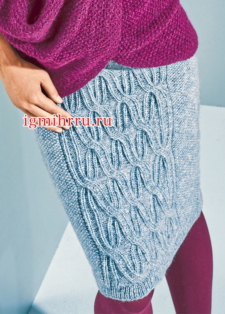 Серо-голубая юбка с рельефным узором Размеры: 34/36 (38/40) 42/44 Размеры российские: 40/42 (44/46) 48/50 Вам потребуется: 150 (150) 175 г серо-голубой пряжи (44% полиамида, 34% шерсти альпака, 22% шерсти; 113 м/25 г); спицы № 4 и 5; круговые спицы № 3,5. Техника вязания. Мелкий жемчужный узор: нечетное число петель. В лицевых и изнаночных рядах вязать попеременно 1 изнаночная, 1 лицевая, закончить 1 изнаночной. Ребристый узор с перекрещенными петлями: число петел...