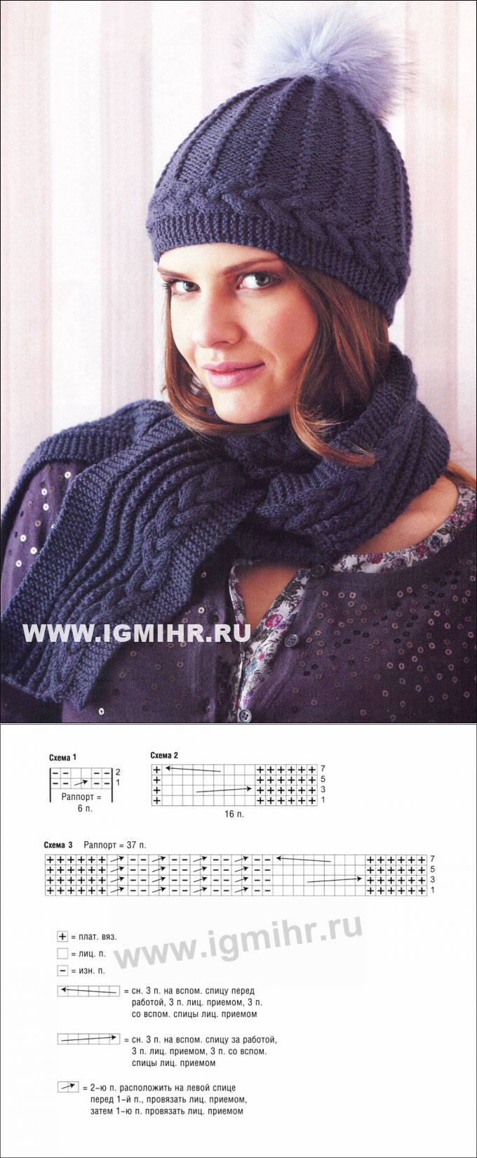 Симпатичный комплект: шапочка с пушистым помпоном и шарф. Спицы