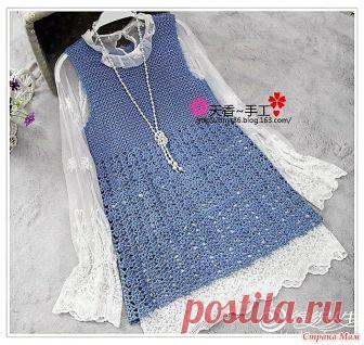 . Голубая туника двумя узорами. Эта туника связана двумя узорами.Верх вяжется по отдельности одним плотным узором а после соединения переда и спинки подол выполняется другим более ажурным.