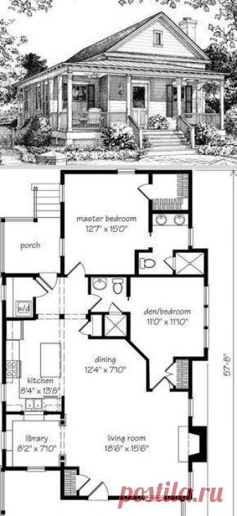 Old Pond Place ~ 1255sf, 31' x 58'. 2 bdrms, 2 baths, small pantry, fireplace, laundry, small library. Southern Living house plan SL-1175. (Enclose rear porch, use extra space for mud room & storage.) #cottage #cabin Old Pond Place ~ 1255sf, 31' x 58'. 2 bdrms, 2 baths, small pantry, fireplace, laundry, small library. Southern Living house plan SL-11...