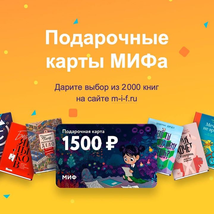 Это случилось: по многочисленным просьбам наших читателей у нас появились подарочные карты — Это доступ к книжной Вселенной МИФа, в которой больше двух тысяч книг. Не нужно гадать, какая из них понравится и пригодится. Каждый сможет заказать книжки по вкусу. Карты электронные, номинал — 1500, 2000, 3000 и 5000 рублей. Мы знаем, как важно дарить (и получать) подарки вовремя, поэтому доставим красивое письмо с картой на любую электронную почту мира за пару секунд. Пусть подарков «в точку» станет…