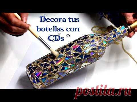 Botella decorada estilo mosaico con Cds - ArteRIV