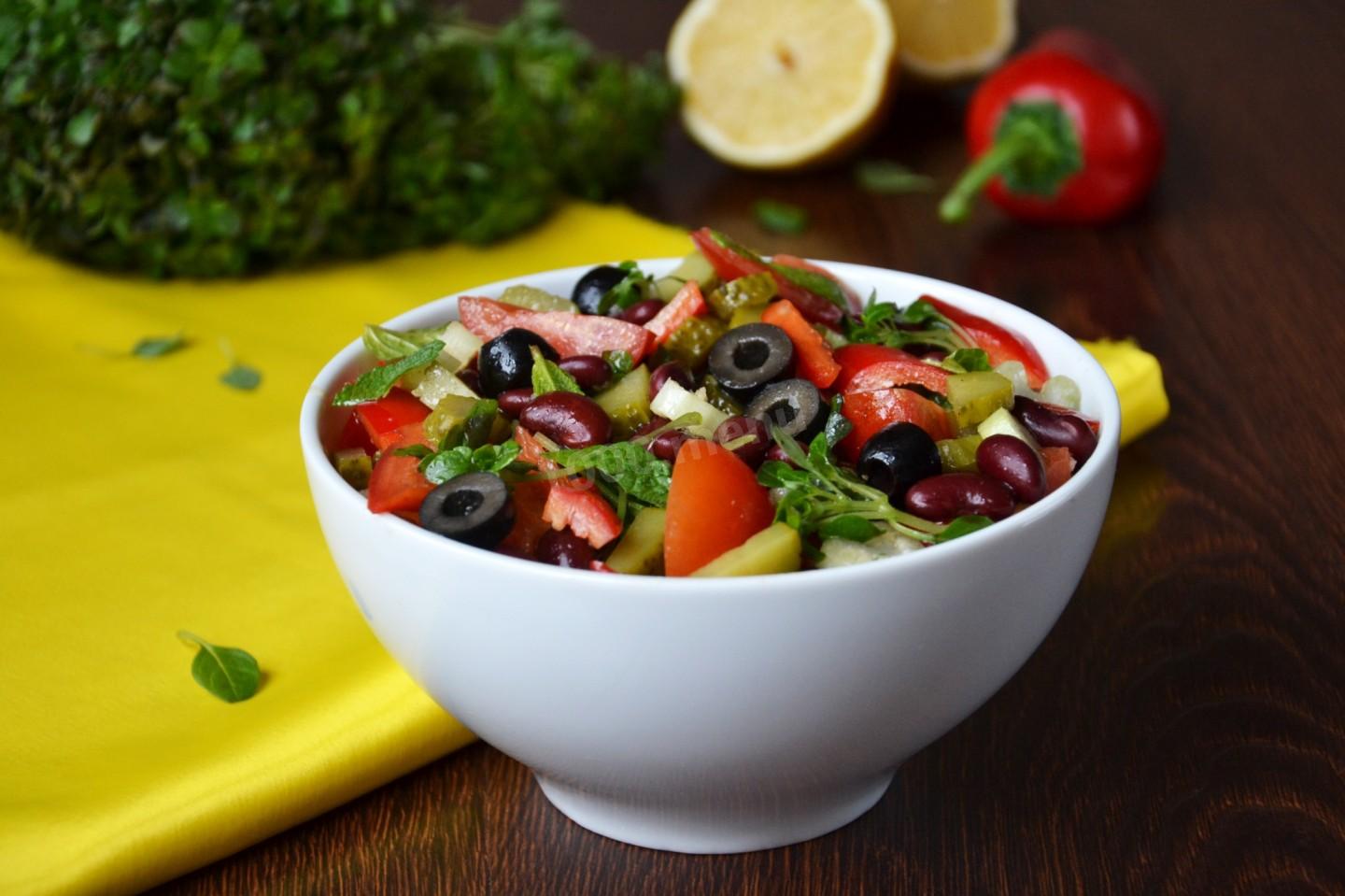 - 1. С фасоли и маслин слить жидкость. 2. Огурцы, перец и сельдерей нарезать ломтиками. Помидоры нарезать четвертинками, оливки разрезать пополам. 3. Мяту и базилик вымыть, обсушить и крупно порубить. 4. Заправка. Чеснок пропустить через пресс. Соединить чеснок, оливковое масло, лимонный сок, соль и молотый перец. Слегка взбить до однородности. 5. Соединить в салатнике все ингредиенты, полить заправкой и перемешать.