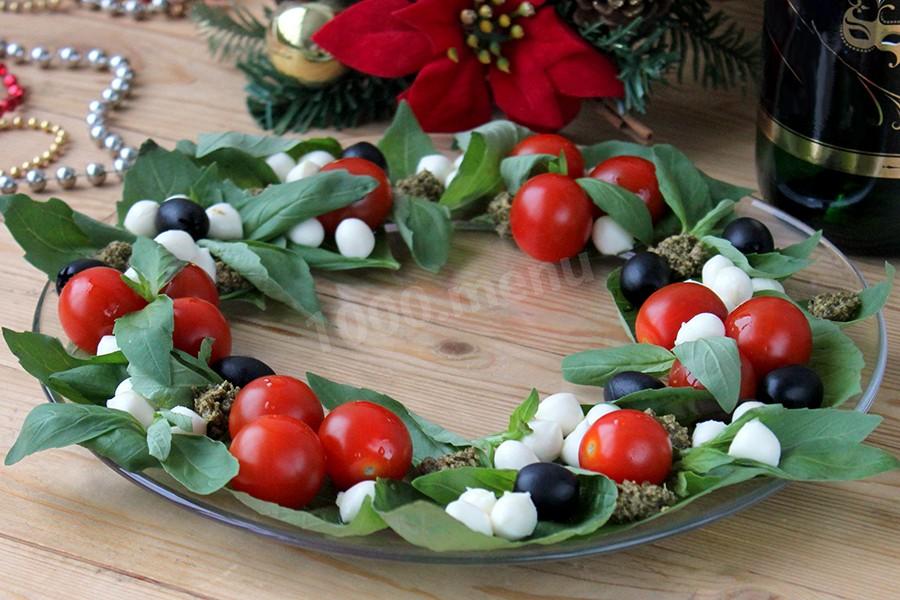- 1. Базилик промойте, аккуратно обсушите бумажным полотенцем. То же сделайте и с помидорами. 2. Выберите большое плоское блюдо, разложите по краю большие лисья базилика и рядом выложите помидоры. На этом этапе блюдо уже напоминает рождественский венок. 3. Добавьте шарики мини моцареллы, выложите маслины и соус песто (соус выкладывайте чайной ложкой, придавая ему округлую форму). 4. Сбрызните салат оливковым маслом и бальзамическим уксусом. Готово! Праздничного вам настроения и, конечно же, приятного аппетита!