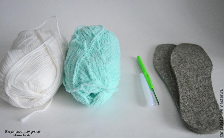 Вяжем домашние сапожки к новому году Сложность: средняя Время работы: 2 часа Материалы: плюшевая пряжа, шерстяная пряжа, войлочная подошва, шило, крючок Со слов автора. Я хочу рассказать вам, как я вяжу домашние сапожки. У каждого из нас сохранились воспоминания об огромном количестве теплых шерстяных носков, связанных добрыми руками...