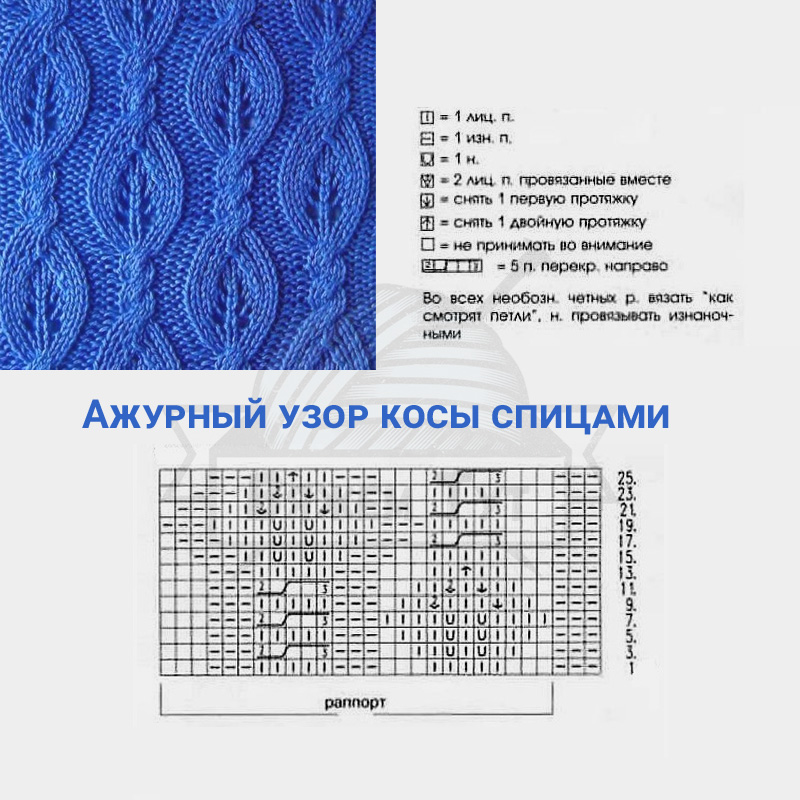 Ажурный узор косы спицами Такая косичка лучше всего смотрится из плотной пряжи средней толщины. Это замечательный узор для женских летних кофточек, топов. На сх. показаны только ЛР. ИР выполняем по рис-ку. Накиды в ИР свяжем изнаночн. п. Горизонтальный Р равен 16п.+3п.+2кр.