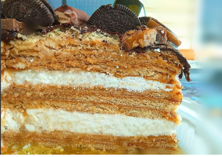 Торт*Полёт шмеля*....медовик,хрустящее безе,сметанный и сливочный крем со сгущёнкой...