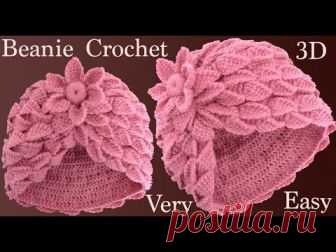 Gorro a Crochet con trenzas de hojas y flor 3D en punto tunecino tejido tallermanualperu