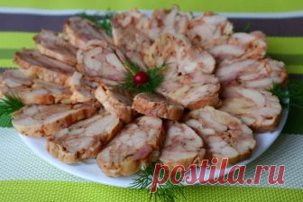 - 1) Для этой закуски лучше всего подойдут куриные бедра, но можно использовать и голени с грудинкой. Мясо необходимо отделить от костей. Я использую мясо вместе со шкурками, но шкурки можно снять и приготовить без них. Нарезаю мясо на произвольные кусочки. 2) Мясо солим, перчим по вкусу, добавим 1 ч.л. сладкой паприки, 1/2 ч.л. чабреца и 1/2 ч.л. сухого чеснока. Хорошо перемешаем, распределяя специи по мясу. Желатин в этом рецепте не понадобиться. Ветчина отлично держит форму благодаря своим натуральным желирующим свойствам. 3) Расстилаем фольгу, сверху выкладываем подготовленное мясо на один край. Заворачиваем рулетиком. Фольги не жалейте, нужно хорошо упаковать мясо, чтобы сок не вытекал. 4) Запекаем в духовке при температуре 180*С на среднем уровне без конвекции 80 минут. Вынимаем из духовки, сверху ставим пресс, у меня разделочная доска и 1 кг. крупы. Отправляем в холодильник на 6-8 часов, а лучше на ночь. 5) Как видите активного времени на приготовление уходит минимум, а в результате получается вкуснейшая, натуральная мясная нарезка, которая никого не оставит равнодушным! То, что нужно к праздничному столу!
