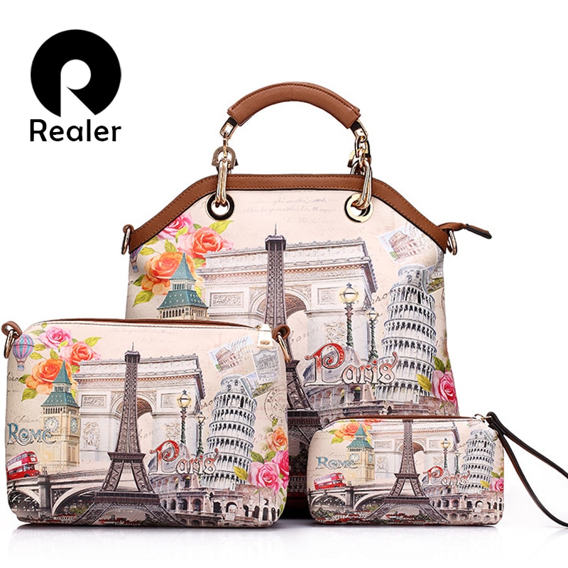 Бренд Realer сумка женская с рисунком Эйфелева Башня, большая сумка с короткими ручками + маленькая сумка на ремне через плечо + мини Клатч, в 1 заказе набор из 3 сумок купить на AliExpress