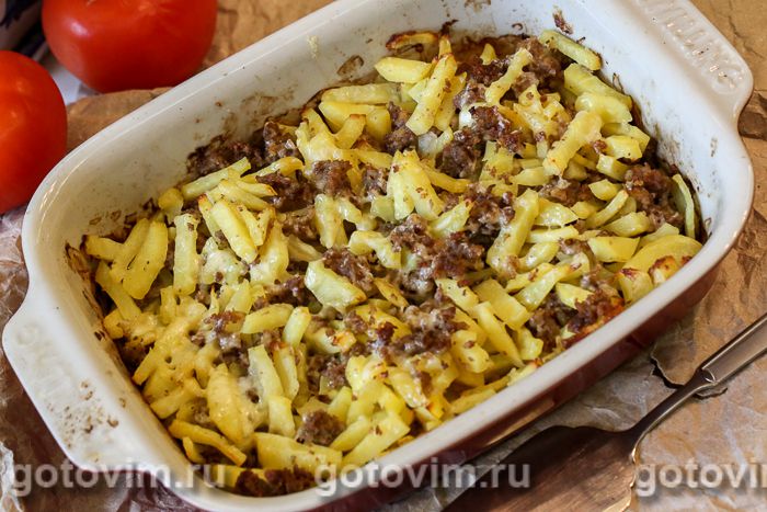 Картофель с фаршем в духовке. Рецепт с фото Мясо с картошкой можно приготовить разными способами. Предлагаю простой и очень удачный рецепт запеченного в духовке картофеля с мясным фаршем. Нарезанный брусочками картофель, пропекаясь одновременно с мясом, успевает напитаться мясным соком и покрыться аппетитной корочкой. За несколько минут до готовности можно посыпать картошку с мясом тертым сыром, чтобы на запеканке образовалась аппетитная сырная корочка.