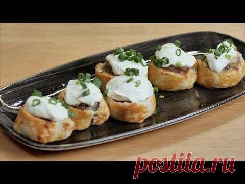 Закуски на праздничный стол. Рулетики с мясом и сметаной. Горячая штучка