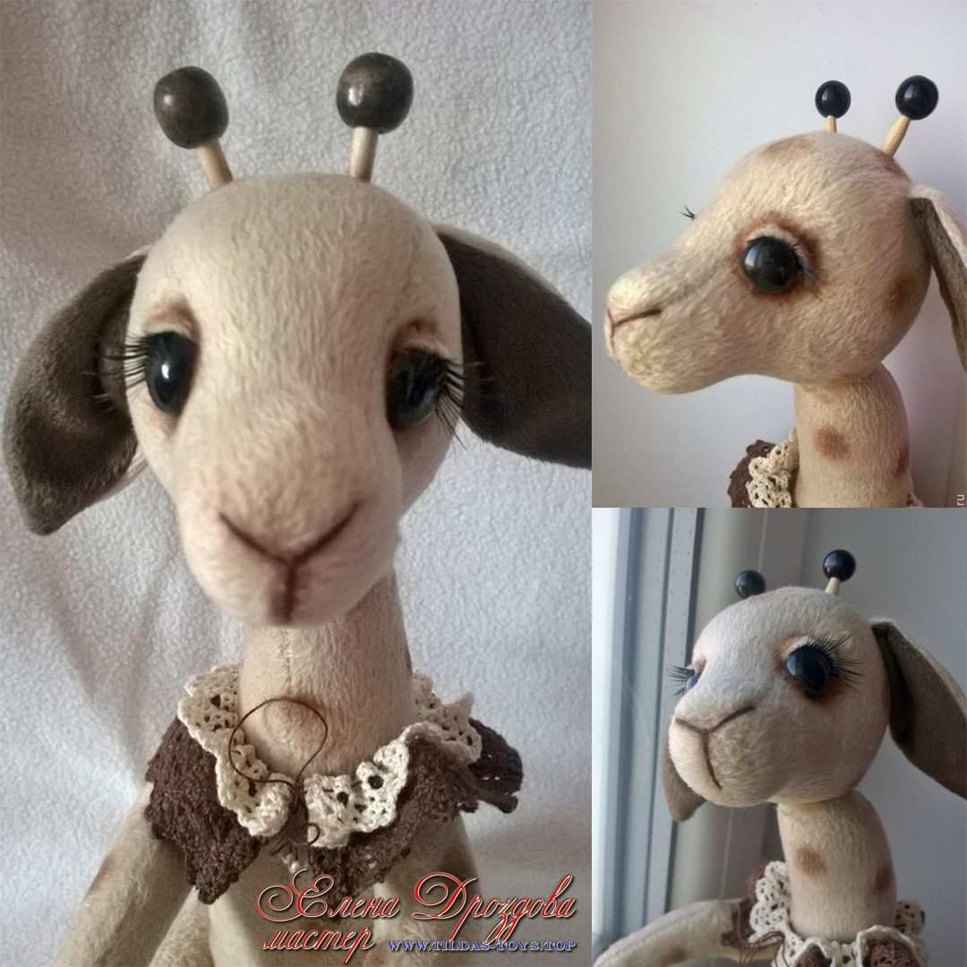 Жираф - Игрушка выполнена из плюша. Все конечности подвижны, голова поворотная. Наполнитель холлофайбер. Тонировка художественной пастелью. Сидит самостоятельно, стоит только с опорой. Работа представлена для примера https://vk.com/id519894738?w=product-174857415_2759952