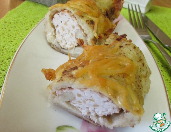- Далее на каждый готовый драник выкложить примерно столовую ложку фарша и распределить его по дранику. Затем скрутить рулет.