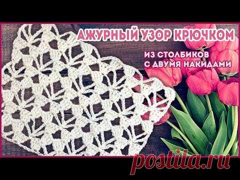 Простой ажурный узор крючком из столбиков с двумя накидами для топа или кардигана