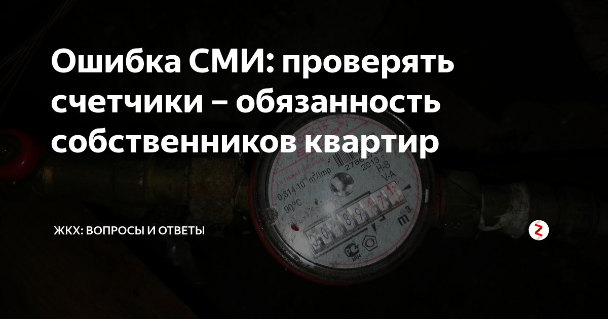 Ошибка СМИ: проверять счетчики – обязанность собственников квартир Ряд крупных СМИ сообщило, что Правительство сняло с собственников обязанность следить за состоянием квартирных счетчиков. Это ошибка, которая, к сожалению, была допущена СМИ. Если Вы уже читали об этом и решили, что теперь не Ваша обязанность следить за исправностью и поверкой счетчиков, то знайте, что это не так.