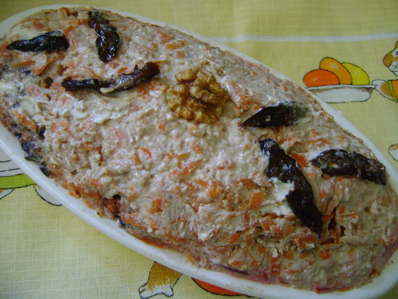 "Салат с черносливом" Взять 2 крупные свеклы и 3 моркови, отварить до готовности, очистить и натереть на крупной терке. Если свекла очень сочная - отжать лишний сок. 1 стакан фасоли также отварить (можно взять консервированную). 200г чернослива замочить в горячей воде на 15 мин, отжать и нарезать тонкими полосками. Приготовить соус: 6 зубчиков чеснока и 1,5 стакана грецких орехов измельчить (можно в блендере) и смешать с 2 стаканами майонеза (постного). На блюдо выкладыват...